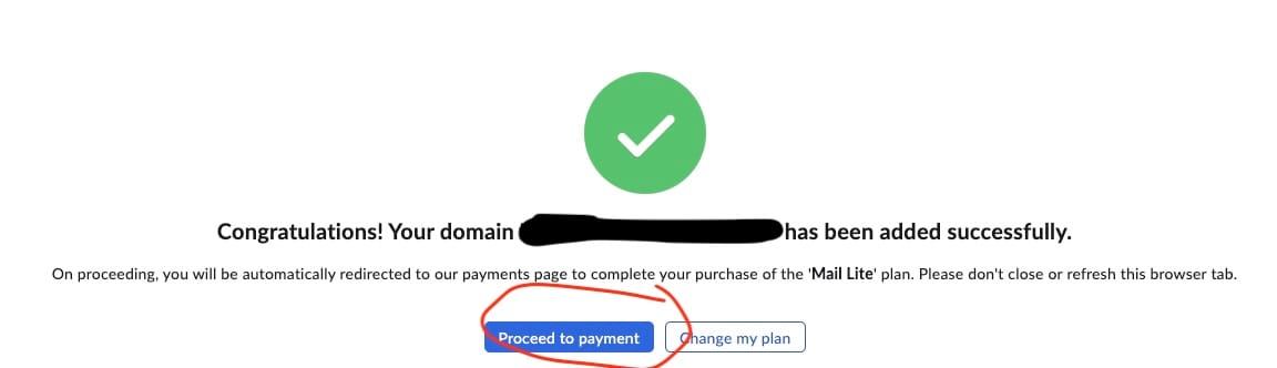Once you have added your domain you will be prompted to Proceeed to payment.