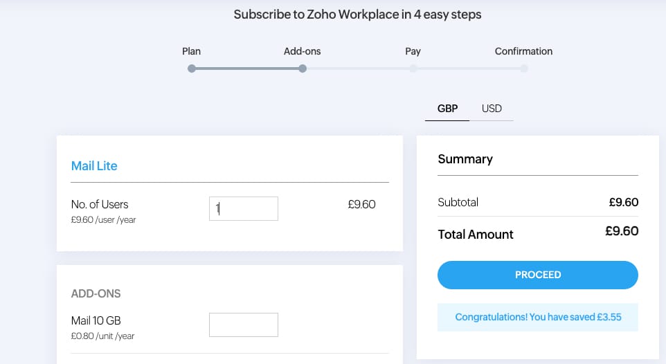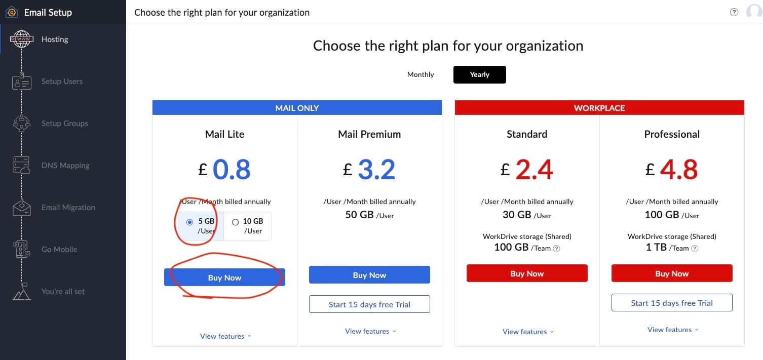 Select the 5GB plan on Mail Lite and click the blue BUY NOW button