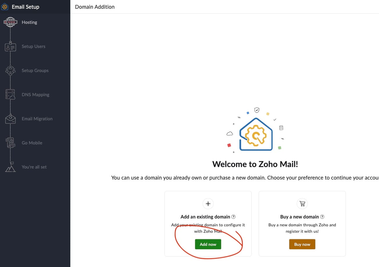 You will be connecting your existing domain so select the left-hand option – ADD DOMAIN